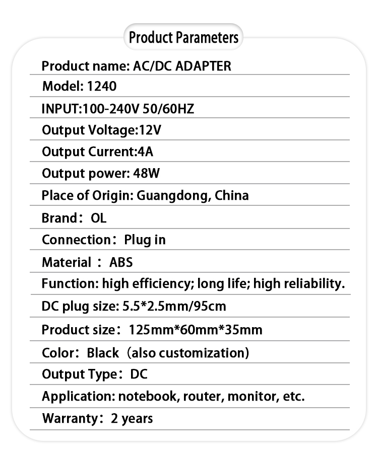 Strong & Stable Power Supply:With an output power of 48W (12V/4A) and an input voltage of 100 – 240V, 50/60Hz, it widely adapts to global power grids, providing stable power for electronic products like LED lights, mobile phones, and laptops.