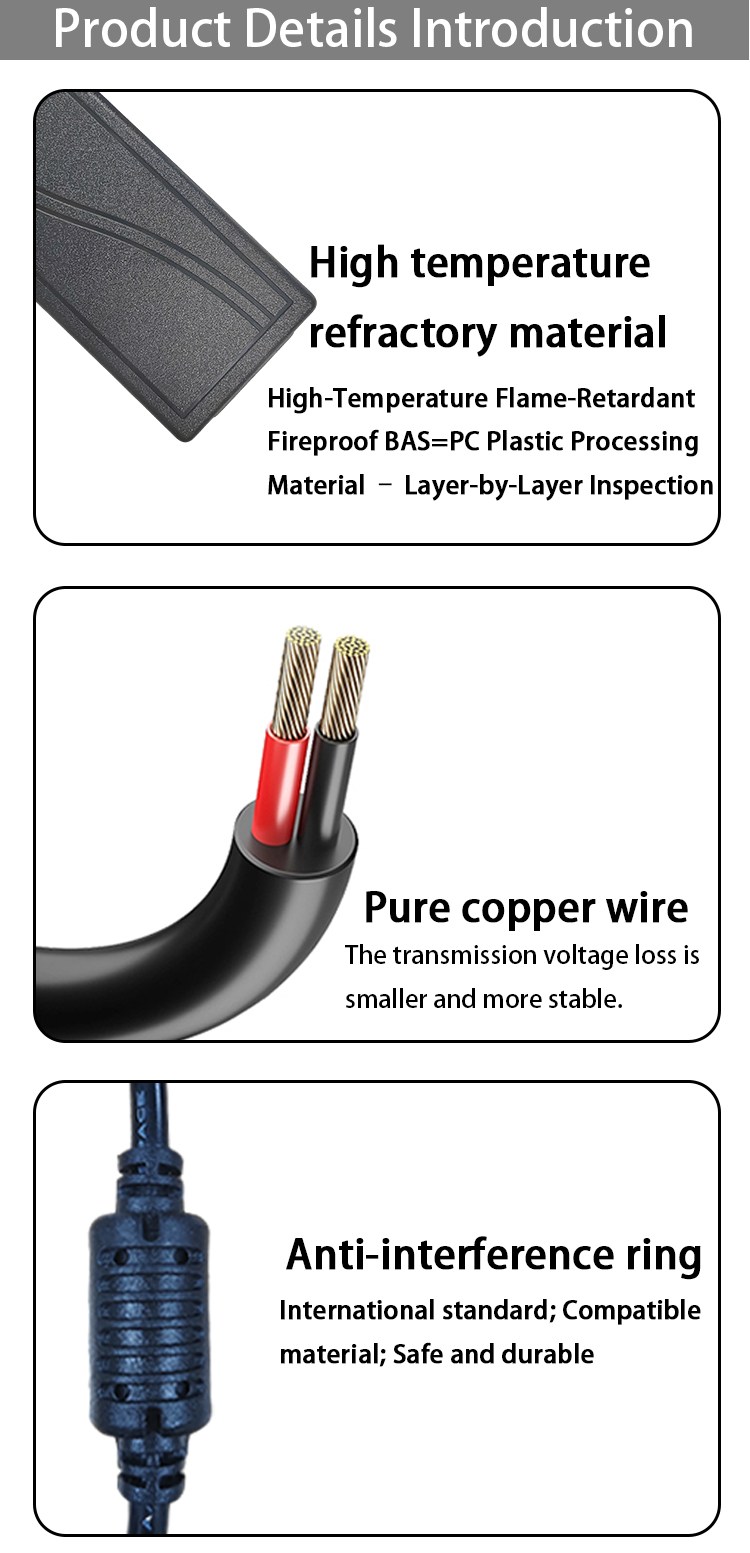 Convenient & Thoughtful Design:95cm cable with plug – in connection for flexible use; black appearance supports customization. DC interface is 5.5*2.5mm, and plugs cover EU, US, UK, AU standards to meet diverse scenario needs.